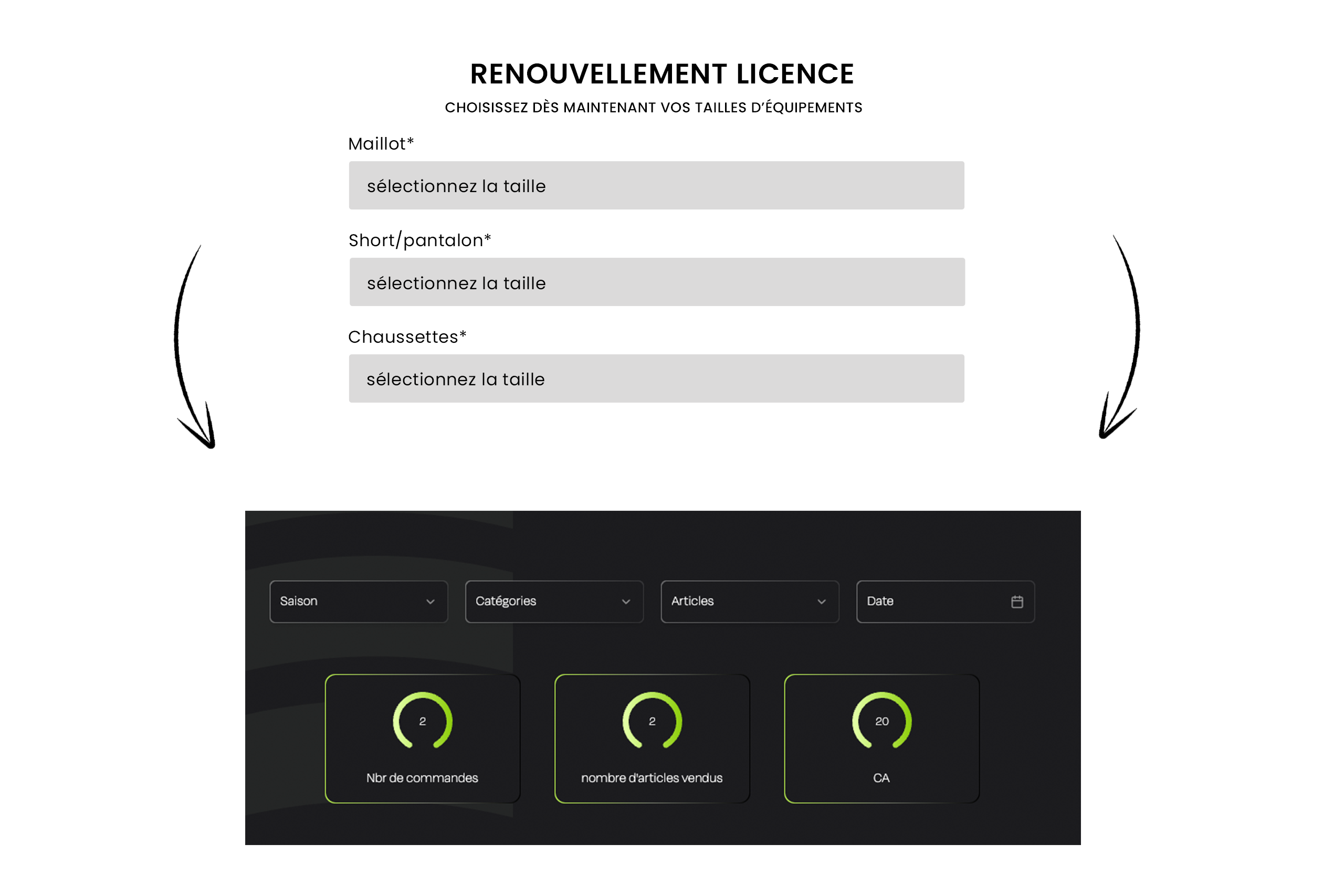 Dès l’inscription, vos licenciés saisissent leur taille d’équipement. Cette information est aussitôt transmise à votre boutique en ligne, vous permettant de lancer la commande groupée avec une précision totale. Fini les inventaires manuels et les erreurs !