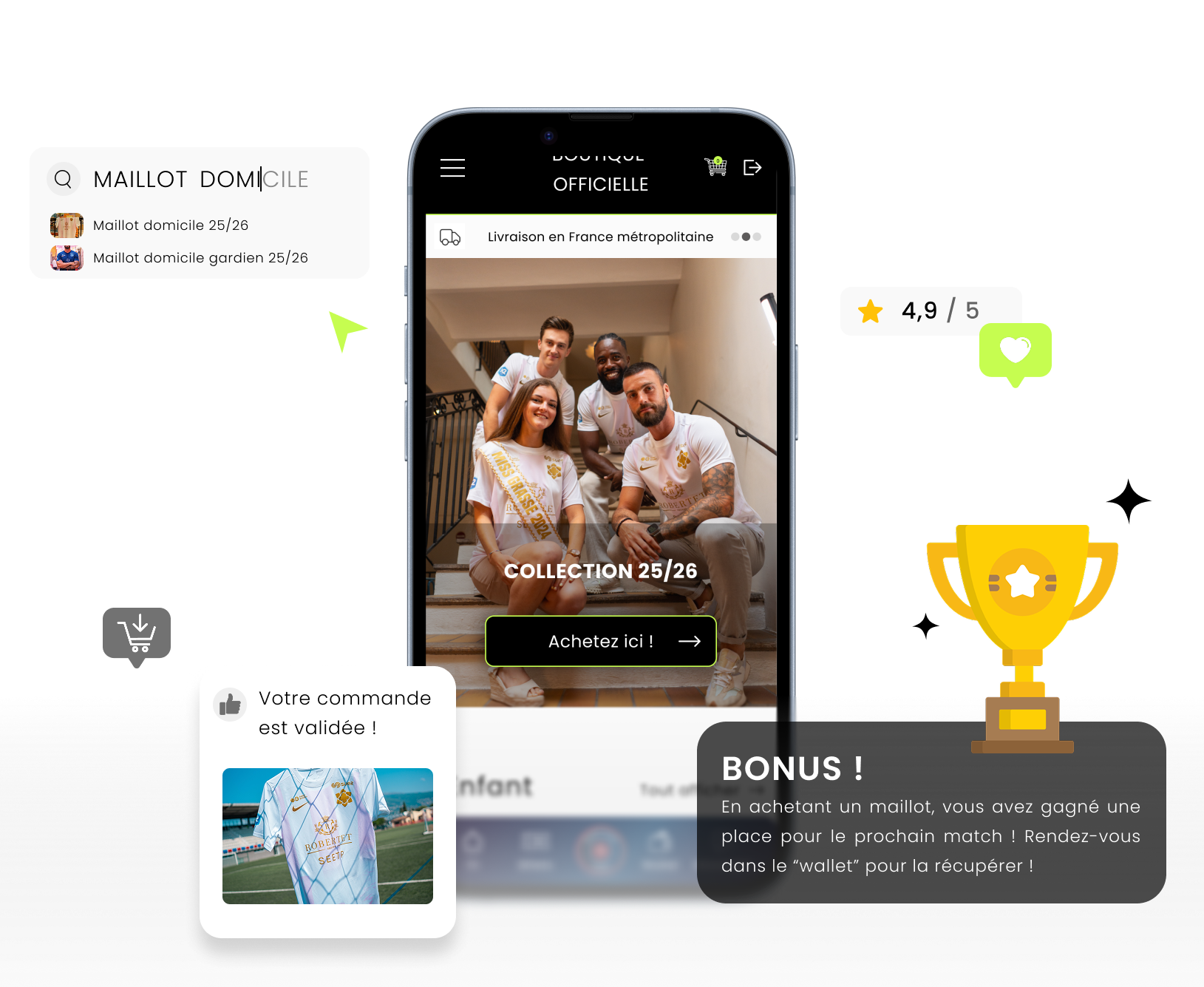 En souscrivant à notre offre de billetterie, le club accède gratuitement à des outils complémentaires et pensés pour faciliter l’animation de sa communauté de fans et de partenaires : Une application dédiée au club, ou les fans peuvent se retrouver au sein d’une communauté exclusive tout en accédant à leurs achats, aux dernières actualités du club et à des offres exclusives.