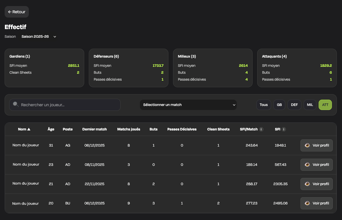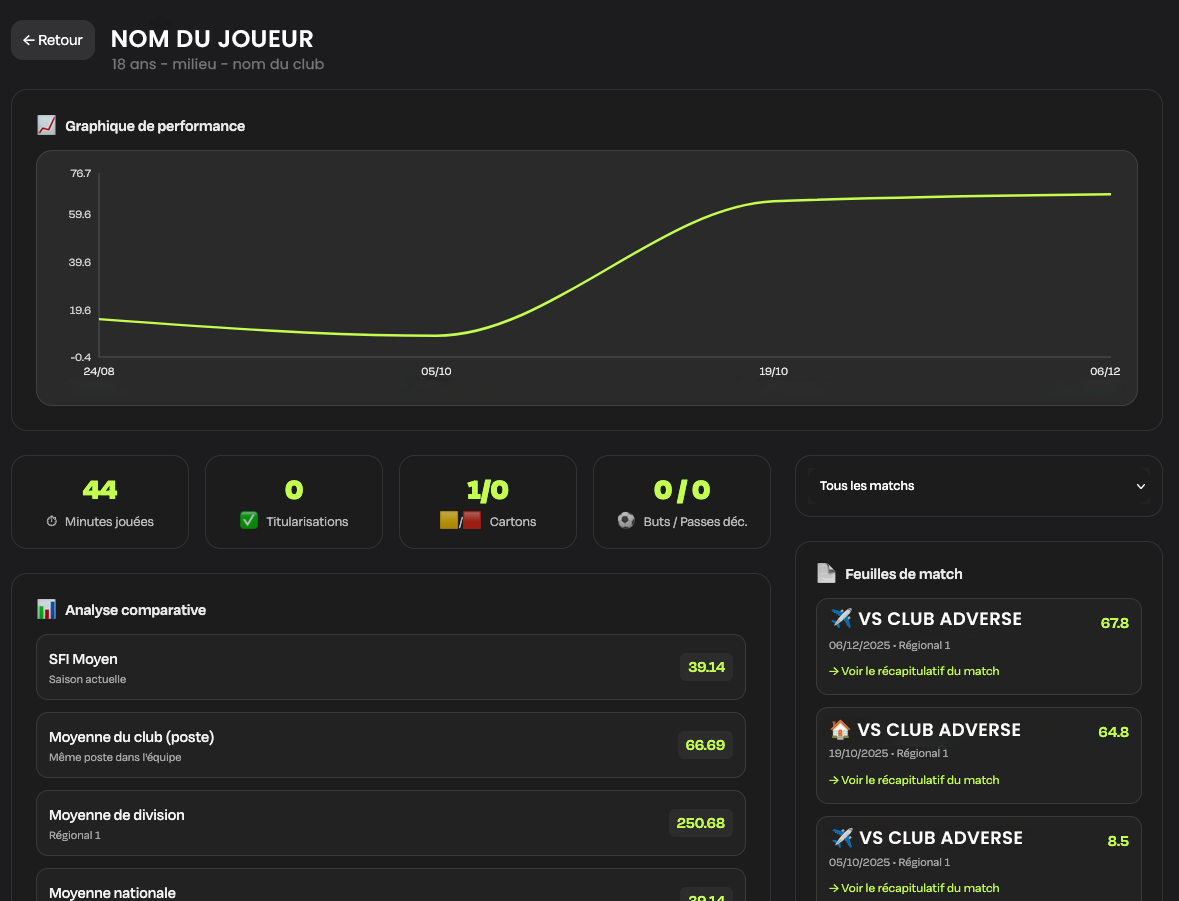 Profitez d’un outil pensé pour le staff technique : suivi global de l’effectif, analyses individuelles et comparaisons par poste. Toutes vos données de match sont centralisées pour une lecture simple et exploitable au quotidien, du club amateur au niveau semi-pro.